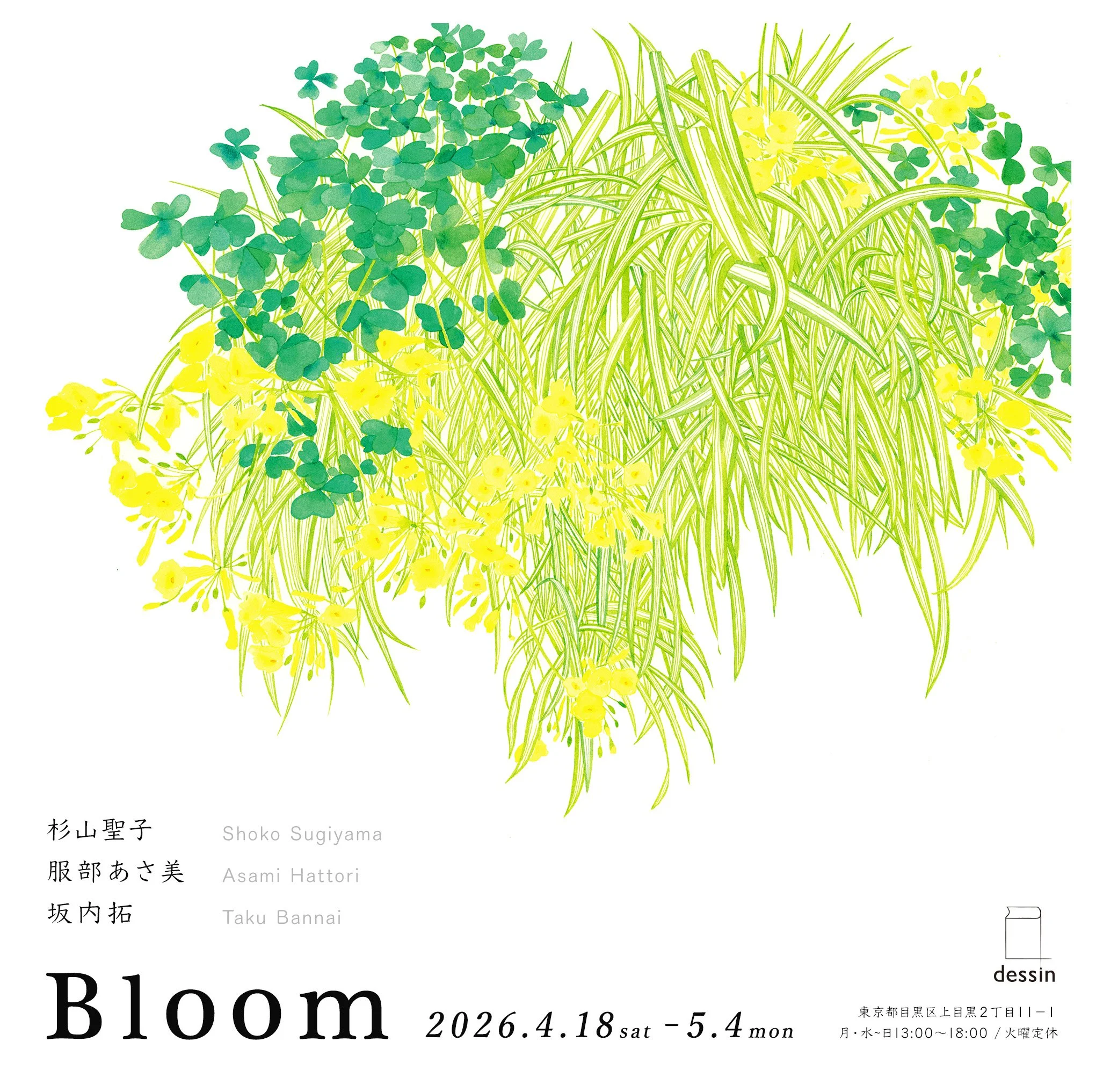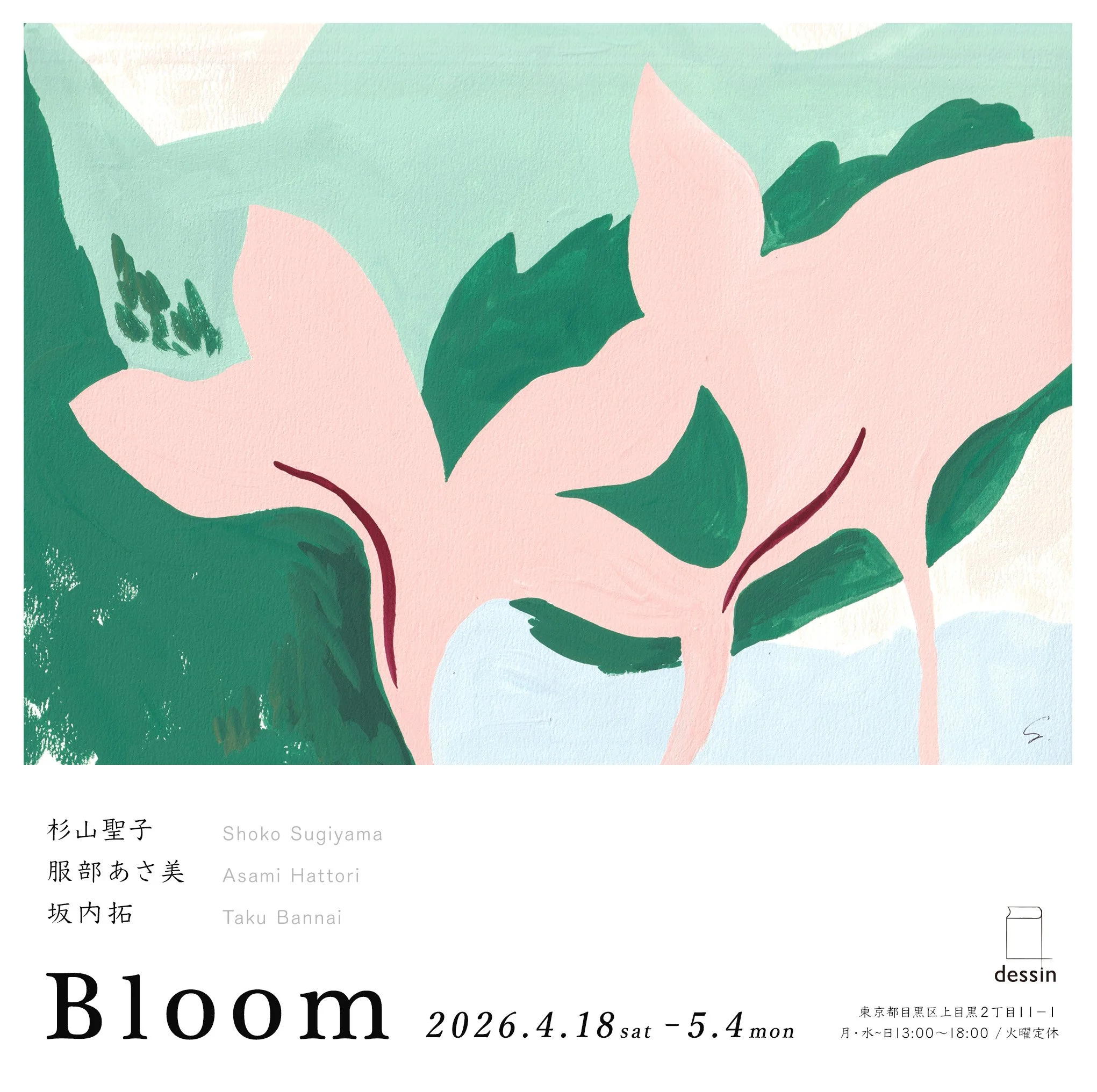 三人展 “Bloom” Saturday, April 18, 2026 1:00 PM 13:00 Monday, May 4, 2026 6:00 PM 18:00 Google Calendar ICS 4月18日(土)より中目黒のdessinで、杉山聖子さん、服部あさ美さんとの展示が始まります。今回の展示開催にあたって、それぞれがスカーフ(2種)を制作しました。お時間ございましたらぜひお立ち寄りください。在廊日等、詳細はインスタグラムなどでお知らせします。→杉山聖子さん→服部あさ美さん-『Bloom』場所:dessin(中目黒)会期:2026年4月18日(土)〜5月4日(月)時間:13:00~18:00 / 火曜定休 杉山聖子さん 服部あさ美さん
