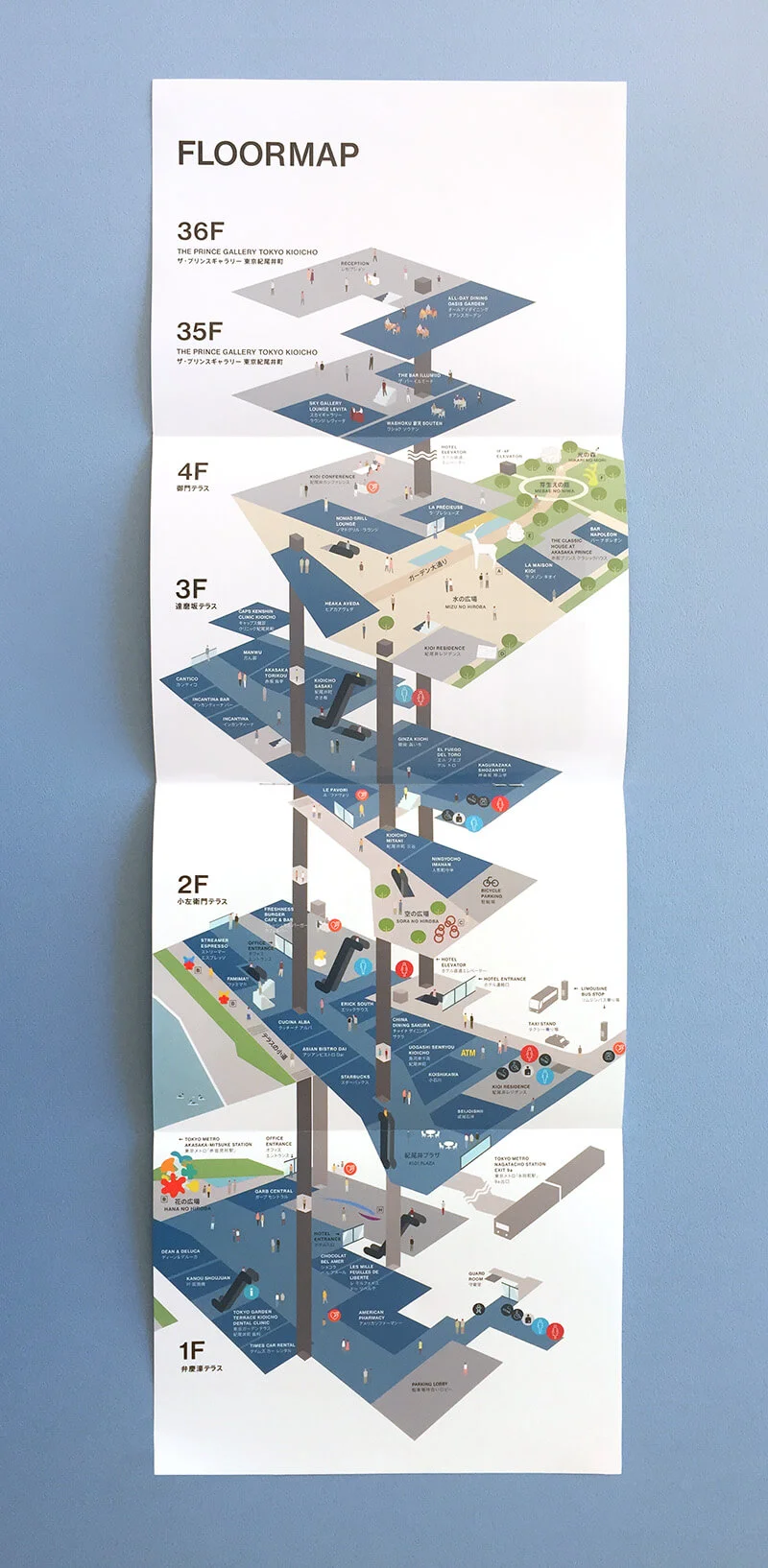 東京ガーデンテラス紀尾井町のフロアガイドのアートワークを担当しました。フロアマップが見開きで大きく展開されます。東京ガーデンテラスへお越しの際は、ぜひ手にとってみてください。